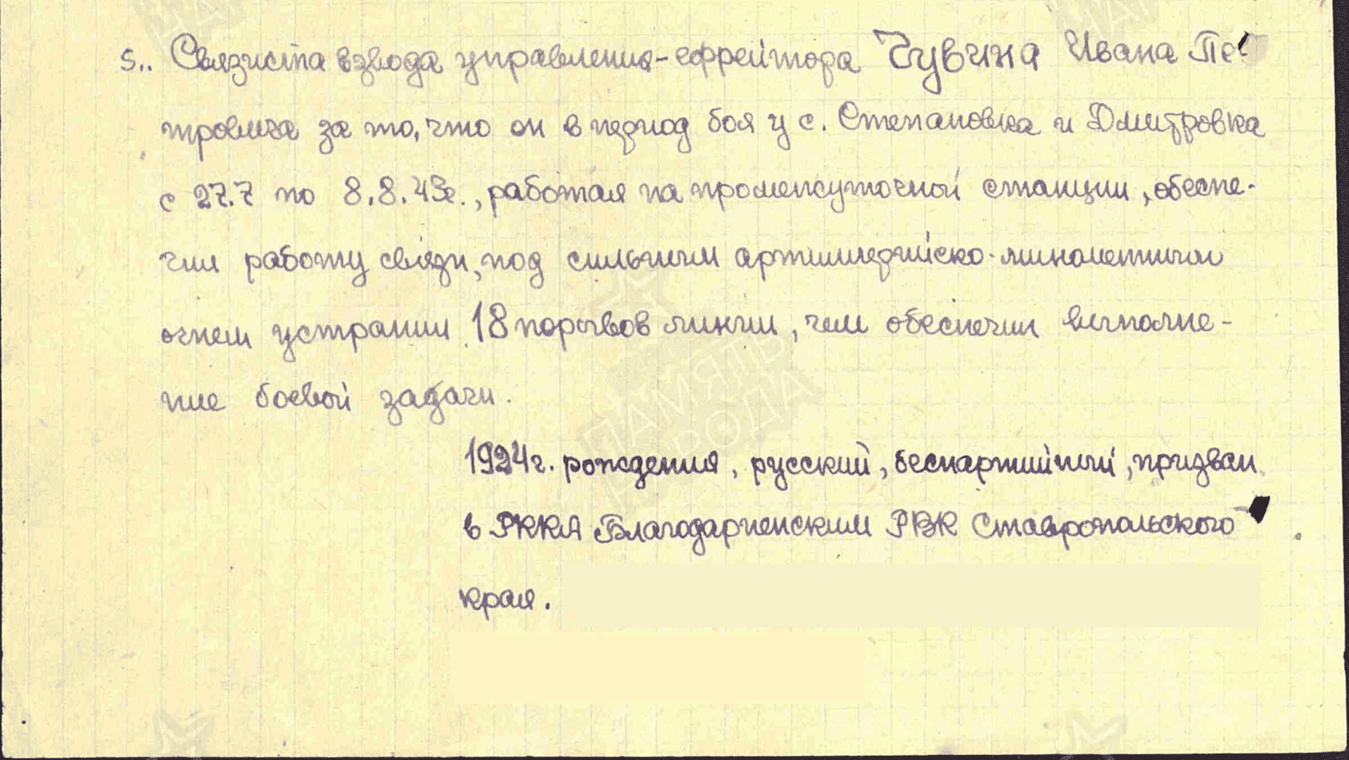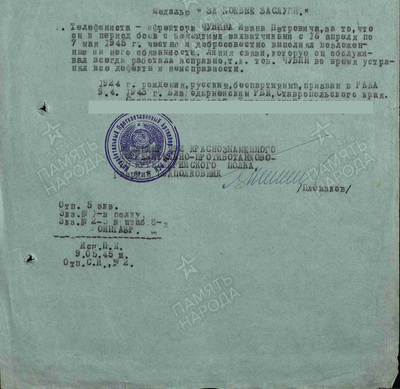 История: «Мой прадед был председателем колхоза, за что имел бронь, но его гражданская позиция не позволила ему оставаться в стороне, он ходил во всевозможные инстанции с просьбой взять его на фронт защищать Родину. За годы службы показал себя с наилучшей стороны и был награжден наградами: медали за отвагу, за оборону Кавказа, за взятие Бухареста, за взятие Будапешта, за освобождение Праги, за победу над Германией .за победу над Японией и другие.